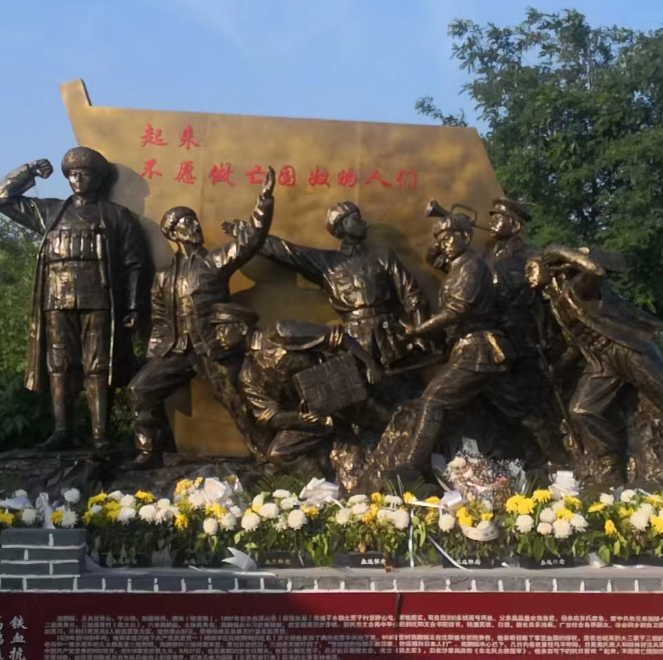 在腰沟小山村国歌讲习所广场上的,塑有一组国歌奠基第一人高鹏振与他的铁血抗战家族英雄塑像,“起来不愿做亡国奴的人们”十一个大字映入眼帘。