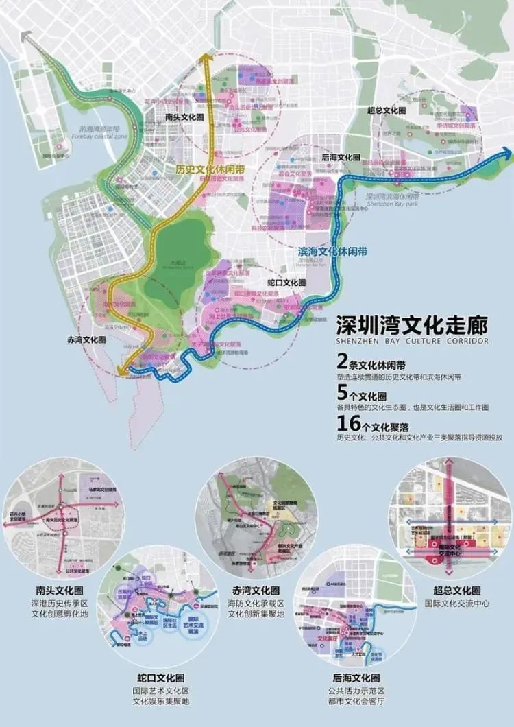深圳湾文化走廊,东起红树林、西至前海湾,串联华侨城、后海、蛇口、前海等片区,构建起“两带五圈多聚落”的整体空间布局,全长约28公里。在这条走廊上,目前已建成华侨城文化旅游聚集区、保利剧院、海上世界文化艺术中心、邮轮母港、天后宫、左炮台、南头古城等文化设施,文化飘带初具雏形。按照规划,文化飘带上即将绽放的“五朵金花”,从东到西分别是深圳湾艺术交流区、深圳湾文化广场、歌剧院国际艺术文化区、赤湾海防文博圈、南头古城特色文化街区,一条集创意设计、传统文化、先锋艺术、前沿时尚于一体的世界级“文化飘带”呼之欲出,赋予深圳湾总部经济带文化内涵。