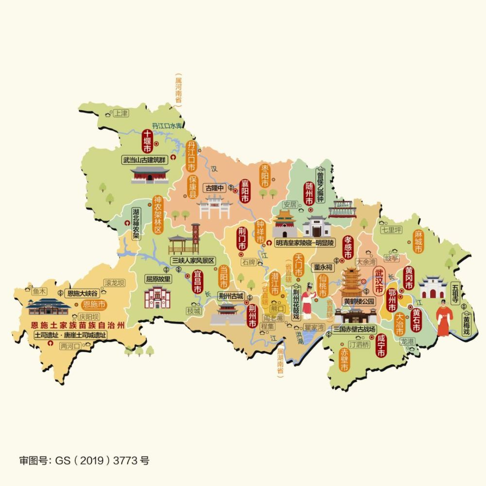 △湖北,位于长江中游,洞庭湖以北,故名湖北。境内湖泊密布、江河纵横,素有“千湖之省”之称。战国时期,湖北为楚国辖地,历经800年的楚国在此创造了辉煌灿烂的楚文化,湖北亦成为楚文化的发源地。湖北具有光荣的革命传统,1911年在这里发生了具有划时代意义的武昌起义,成为辛亥革命的开端,吹响了共和国诞生的号角。湖北人杰地灵,孕育了爱国诗人屈原、民族友好使者王昭君、山水诗人孟浩然、药圣李时珍、民主战士闻一多等杰出人物代表。主要景点有黄鹤楼公园、武当山古建筑群、唐崖土司城遗址、神农架、恩施大峡谷等。辖武汉、黄石、十堰、宜昌、襄阳、鄂州、荆门、孝感、荆州、黄冈、咸宁、随州、恩施土家族苗族自治州等13个地级市及自治州。
