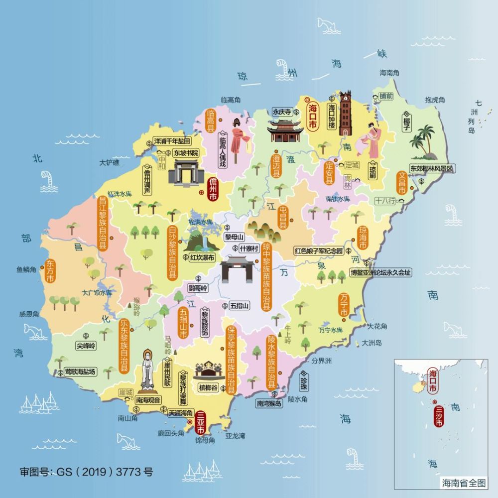 △海南古称“琼崖”“琼州”,简称“琼”。位于我国最南端,与菲律宾、文莱、印度尼西亚和马来西亚为邻。海南是我国唯一全部处于热带的省份,也是我国最大的热带作物产地。动植物药材资源丰富,有“天然药库”之称。是国内发展热带海洋渔业的理想之地。这里蕴藏着丰富的矿产资源,还是理想的天然盐场。海南的旅游资源极其丰富,有着旖旎迷人的海岛风光、多姿多彩的民族风情。著名的博鳌亚洲论坛每年都在这里召开。天涯海角、五指山、东坡书院等风景名胜闻名中外。辖海口、三亚、三沙、儋州等4个地级市。