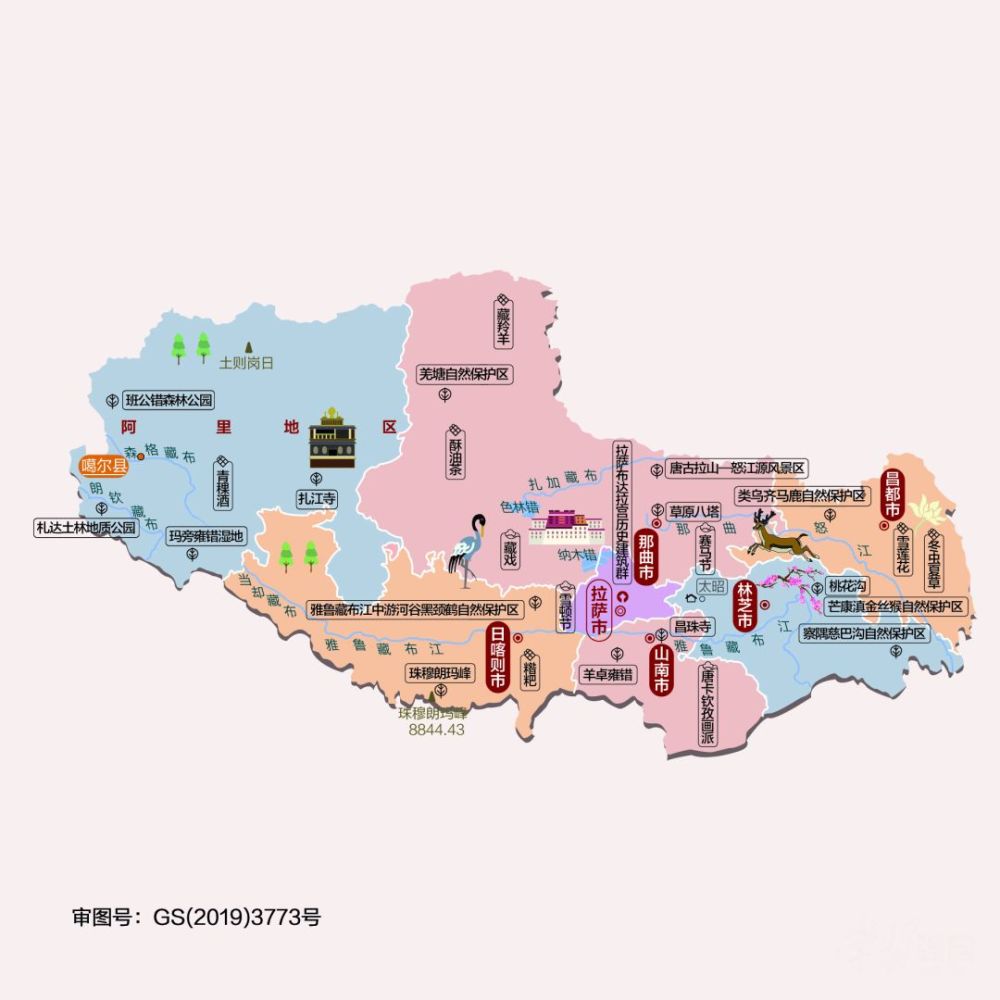 △西藏自治区地处青藏高原的西南部,是世界上海拔最高的地方,有“世界屋脊”“地球第三极”之称。世界第一高峰珠穆朗玛峰屹立于境内。长江、怒江、澜沧江、雅鲁藏布江等河流发源或流经此地。西藏不仅以其雄伟壮观、神奇瑰丽的自然风光闻名,还是我国藏族的主要聚居地、藏文化的发祥地,创造了丰富灿烂的民族文化。拥有世界遗产布达拉宫、大昭寺、羌塘、唐古拉山—怒江源等风景名胜。辖拉萨、日喀则、昌都、林芝、山南、那曲、阿里地区等7个地级市、地区。
