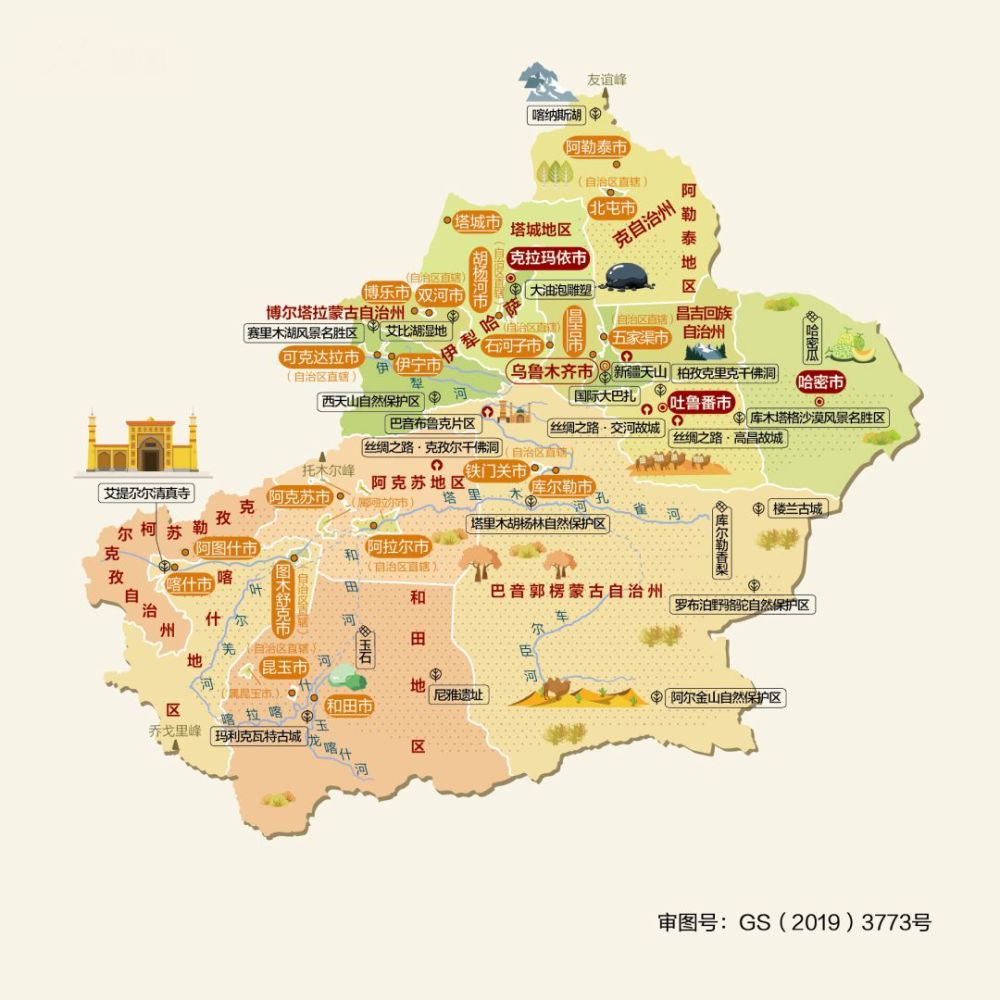 △新疆地处中国西北边陲,是古丝绸之路的重要通道,是各民族迁徙融合的走廊,素有“瓜果之乡”“歌舞之乡”的美誉。新疆具有“三山夹两盆”的地貌特征,自然景观奇特,历史文化底蕴深厚,文物古迹丰富,民族风情浓郁。境内自然与人文景观交相辉映,雄奇壮美的天山被列入世界自然遗产。古丝绸之路上的交河故城、高昌故城、克孜尔千佛洞等人文胜迹享誉中外。辖乌鲁木齐、克拉玛依、吐鲁番、哈密、喀什地区、和田地区、昌吉回族自治州、博尔塔拉蒙古自治州、巴音郭楞蒙古自治州、克孜勒苏柯尔克孜自治州、阿克苏地区、伊犁哈萨克自治州、塔城地区、阿勒泰地区等14个地级市、地区、自治州。