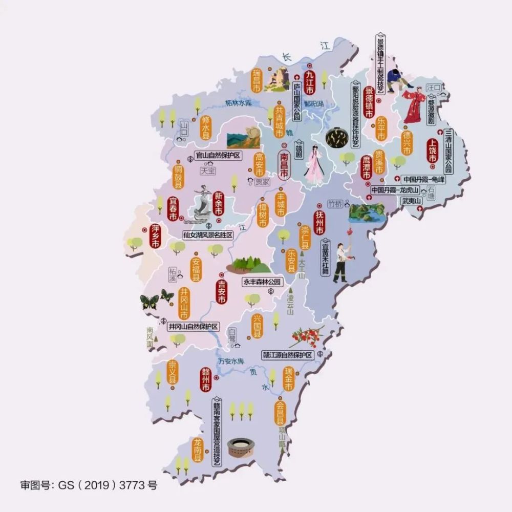 △江西,古称“吴头楚尾,粤户闽庭”。江西是红色文化发源地,井冈山是中国革命的摇篮,南昌是中国人民解放军的诞生地,瑞金是苏维埃中央政府成立的地方,安源是中国工人运动的策源地。景德镇的瓷器源远流长,闻名中外。烟波浩渺的鄱阳湖是我国最大的淡水湖。境内风景名胜众多,世界遗产庐山国家公园、中国丹霞重要组成部分龙虎山-龟峰等闻名海内外。辖南昌、景德镇、萍乡、九江、新余、鹰潭、赣州、吉安、宜春、抚州、上饶等11个地级市。