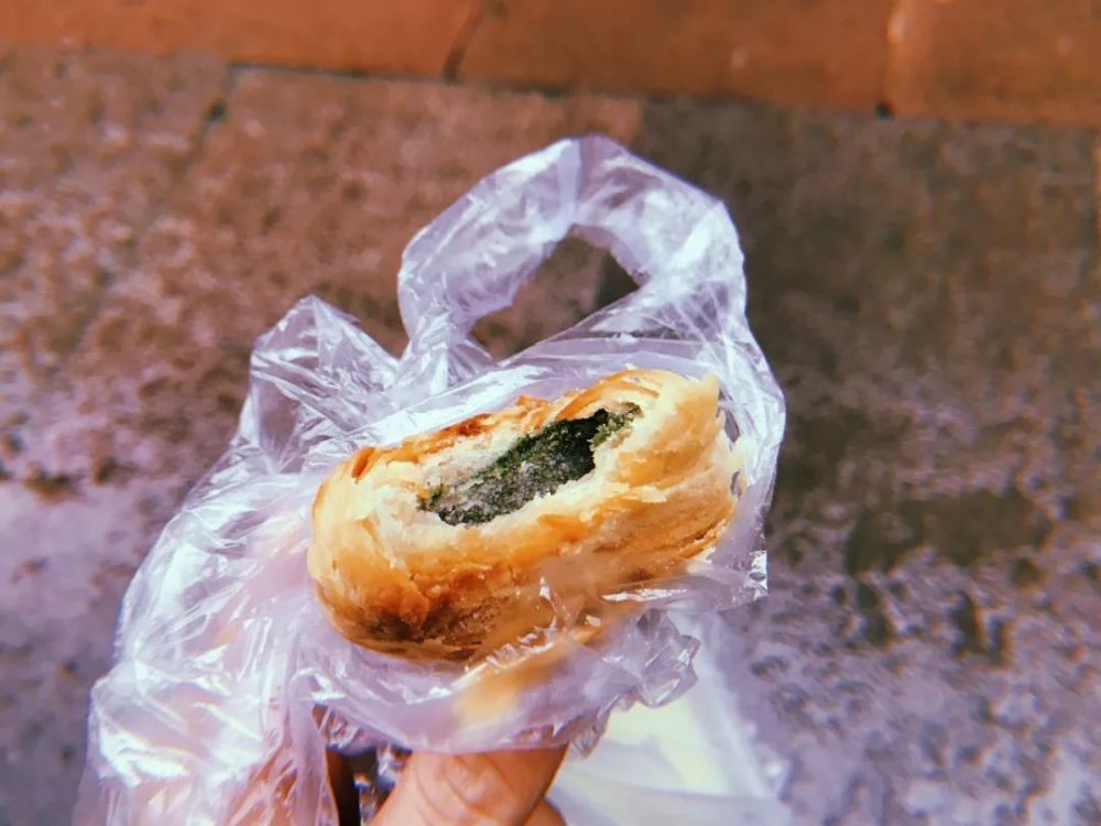 和麦虾不同,泡虾真的有虾。刚出炉的泡虾特别松脆、喷香,一定要趁热吃!被炸得酥脆的外壳裹着鲜嫩多汁的猪肉碎和虾仁(鱿鱼),带着葱花的香气,一口咬下,油脂的香味瞬间盈满口腔,猪肉的香气+小海鲜的Q弹嫩,爽到极致!