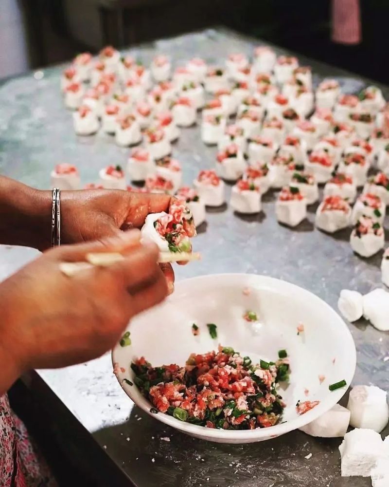 板油红糖馒头是白水洋衍生品。趁着热乎气,从中间掰开,滚烫的板油与红糖在高温的催化下共融共生顺势往外流。撕下表皮的馒头蘸着糖浆,甜而不腻,最够味。
