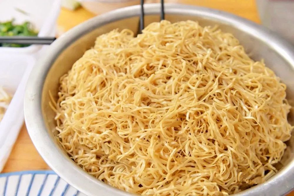 不同于普通面条用手直接揉,拗面是用一根粗大的毛竹人力来回碾压“拗”出来的。这样做出来的面筋道十足,带着一股子碱香味。配上新鲜的笋丝、柔韧的肉丝、清爽的豆腐干丝,汤汁鲜美,一碗吃下绝对满足。