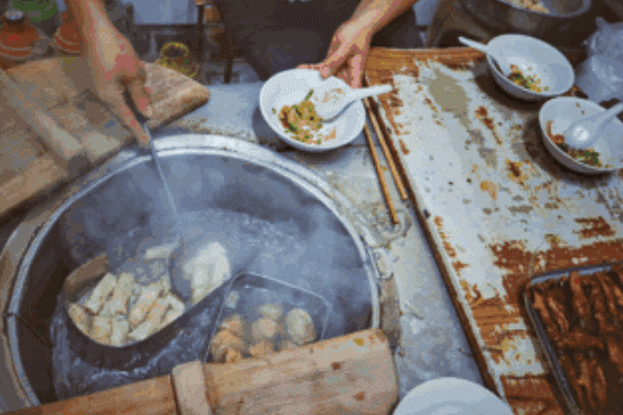 几乎每条街都有一家姜汤面,相比起甜品里点到为止的辣感,姜汤面则是辣得张扬。蛤蜊的新鲜、猪肉的脂香、小青菜的鲜甜、干香菇的陈香、茭白的咸鲜等各种味道的混合在一起,吃上一口,辣中带香,让人欲罢不能!