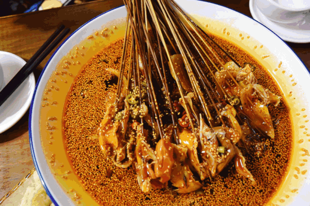 钵钵鸡是一种冷串串,把各类食材用竹签分门别类穿成串,吃的时候,放进藤椒油汤里一捞,油艳欲滴,让人口水。