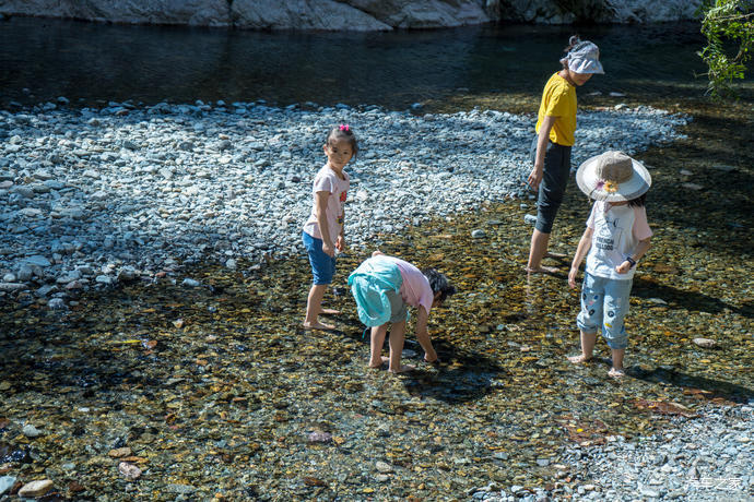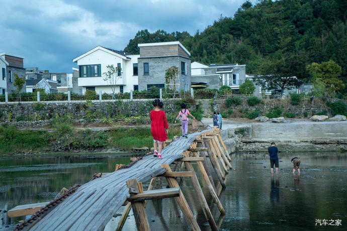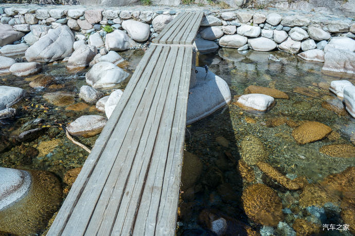 河上有一座木桥,小朋友们开始害怕,后来走上瘾了。