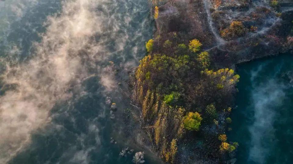 当太阳出来时,金色的光芒穿透迷雾,折射出不同的颜色,晨雾、金光、飞鸟、湖面构成一幅美丽生态画卷。