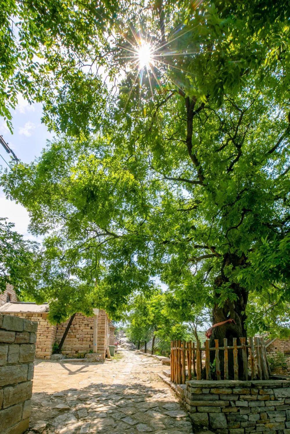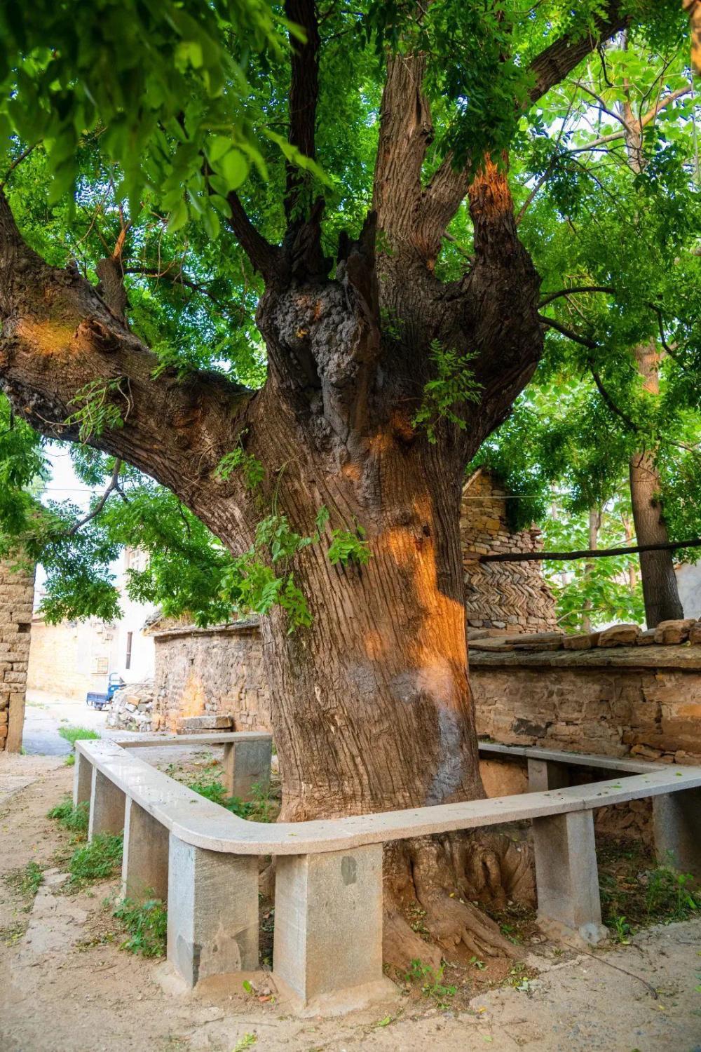 一进村子,首先映入眼帘的是村口的一棵老槐树。树上挂着古树名木保护牌,牌子上显示树龄已有1000年的历史,实在是太古老了!