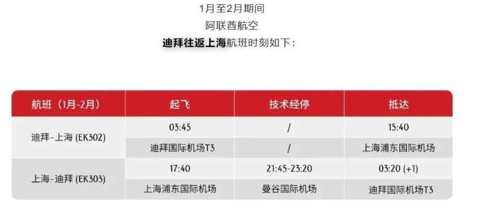 自2023年1月20日起阿联酋航空将重启迪拜往返上海的客运服务(返程航班技术经停曼谷),每周运营两班,于每周二和五各运营一班,采用A380客机执飞。