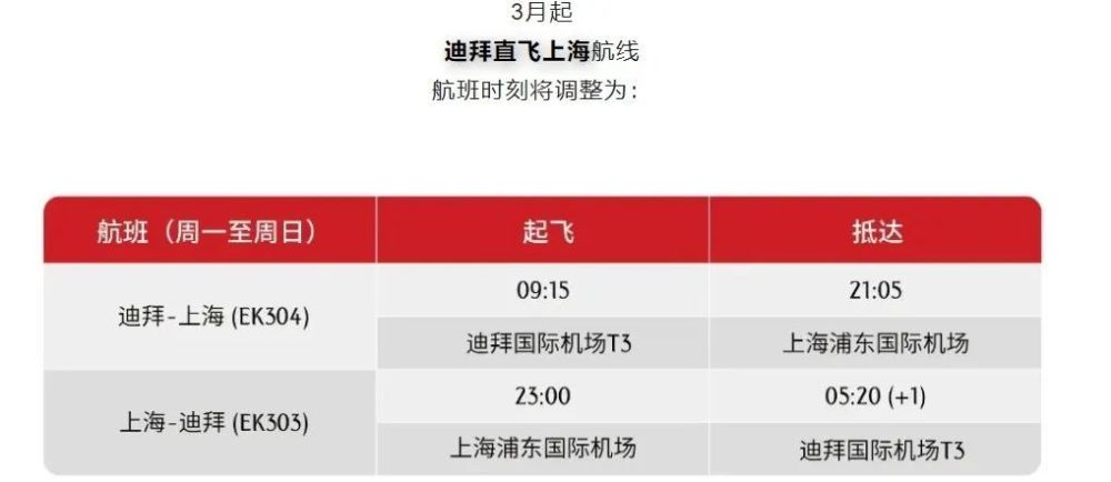 自2023年3月1日起,阿联酋航空迪拜-上海航线将增至每日一班,并改为直飞服务,由三舱版波音777-300ER客机执飞。