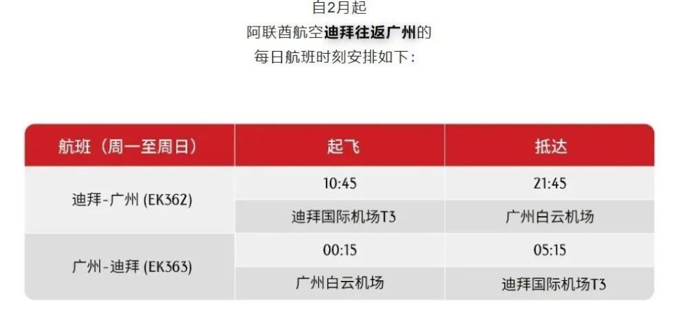 自2023年2月1日起,阿联酋航空将进一步增加迪拜往返广州的客运服务至每日一班,EK362/EK363将全部改为直航且继续采用阿联酋航空A380旗舰机型执飞。