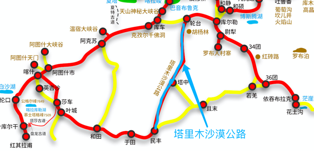 新疆有几条沙漠公路,都是穿越塔克拉玛干沙漠,其中最常走的是“民轮沙漠公路”。起点民丰,终点轮台,自驾需7小时。夜晚时可在沙漠里看星空,白天可观赏怪诞金黄的胡杨林。