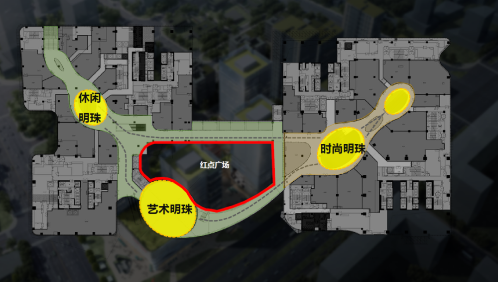 亮点:地铁上盖,连廊相连三大业态+红点广场