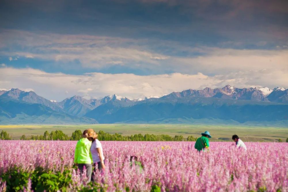 昭苏草原上水草丰茂,背靠雪山,景色绝美,好似一幅色彩艳丽的油画。