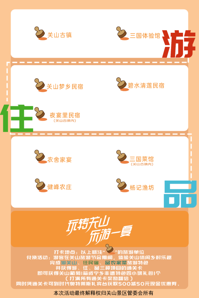 游客在关山旅游节期间,体验关山休闲乡村乐趣,完成游关山、住民宿、品农家菜旅游特色行程,并获得游、住、品三种项目的通关卡,即可获得关山葡萄1箱或宁乡非遗特色四小碟礼包1个(打卡满所有地方奖励翻倍),同时凭通关地图可到时代奥特莱斯礼宾台获取500减50元现金优惠券1张+书亦烧仙草饮品一杯。(通关卡在关山旅游区游客服务中心领取,联系人:陈赞13574154135。)