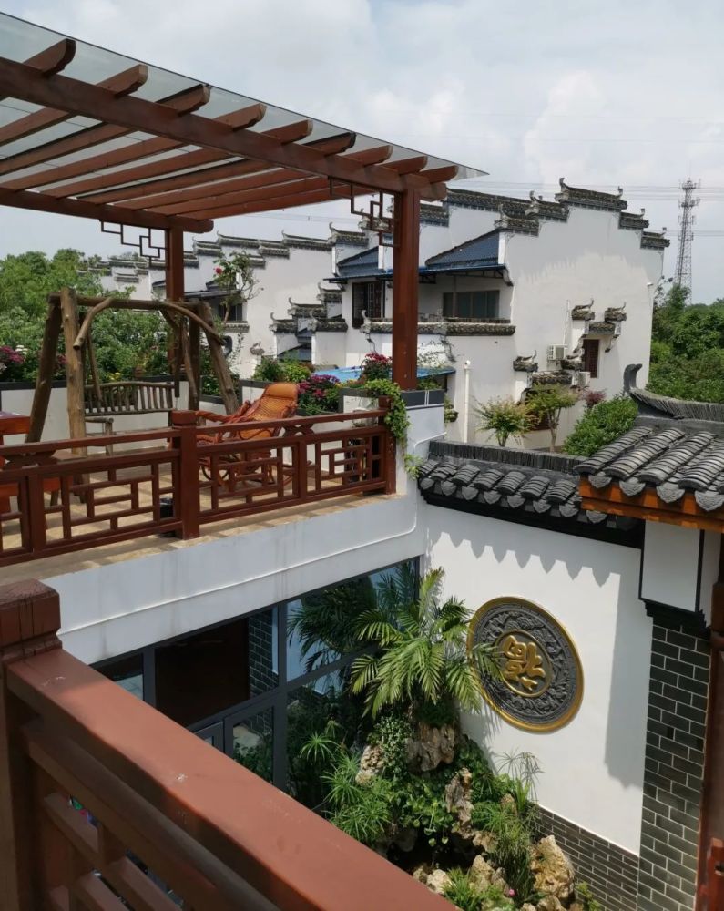 九栋全是徽派建筑风格,白墙青瓦、错落有致,有园林杂陈、水井鱼池、假山流泉其间,内饰有水榭亭台、木雕竹刻、诗词书画和民间艺术品等。