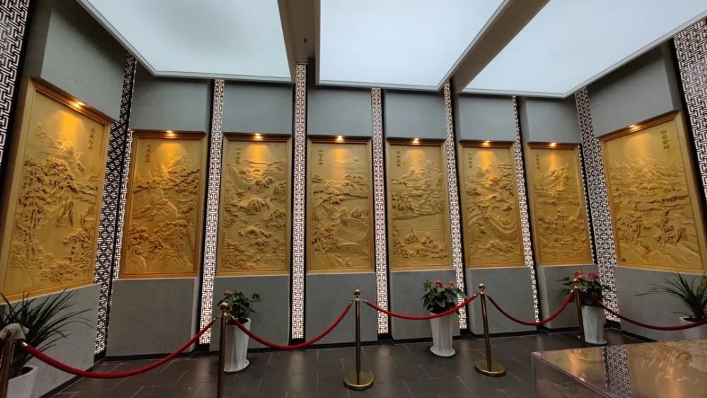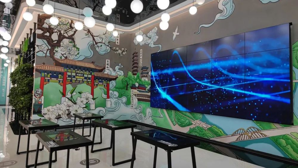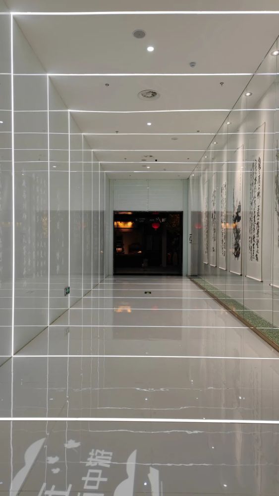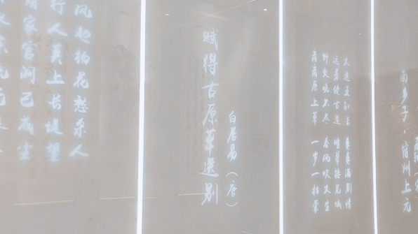 这条充满科技感的长廊,一侧挂着名家字画,一侧用光影闪烁出关于宿州的古诗词。古今结合,别有意趣。