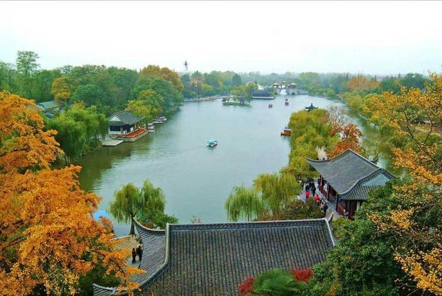 秋天,瘦西湖层林尽染,树叶由青绿色逐渐变成黄色、红色、橙色,一些古建筑镶嵌在各色花草、树木中,色彩斑斓。还有红到惊艳的彼岸花惹人欣喜若狂。