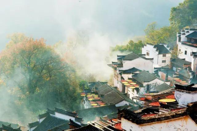 百栋徽派古民居错落有致地散落在坡面上,每到收获季节,屋间成了晒簟的世界,五颜六色的农作物与黑色的屋顶,层层叠层层,一派别开生面的景象。