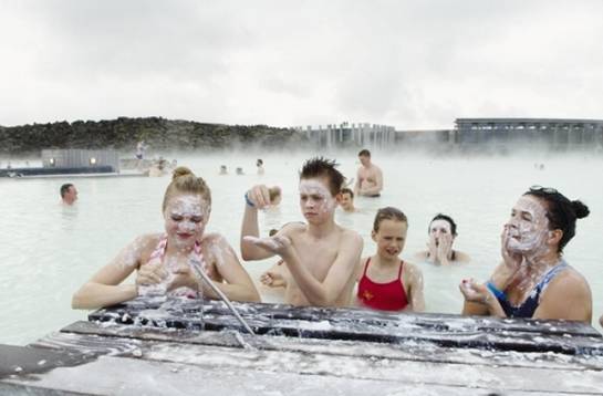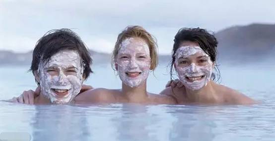 蓝湖位于一座死火山上,地层中有益的矿物质沉积在湖底,用这种白颜色的泥抹在脸上和身体其他部位,有美颜健体作用,功效相当不错。