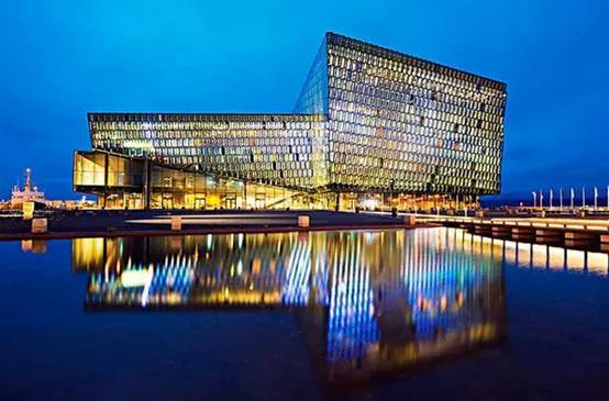雷克雅未克2011年新建的大型音乐、会议中心,玻璃外观会在不同的天气中呈现不同的色彩。