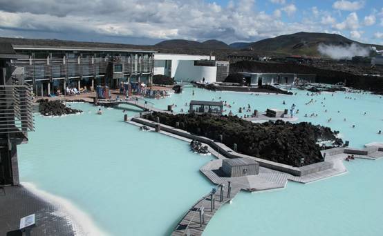 温泉是通过将地底的熔岩加热形成的,因湖底蕴藏了大量的矽,所以湖水呈现蓝绿色,温度保持在37-39度之间。湖水每40小时就会更换一次,是全世界最大的户外天然温泉。