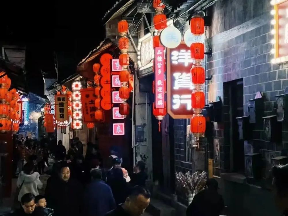 夜晚的老街,变得灯火通明,红色的灯笼高高的挂着,各店铺的灯牌也亮了起来,散发着暖光,别有一番民国风味。