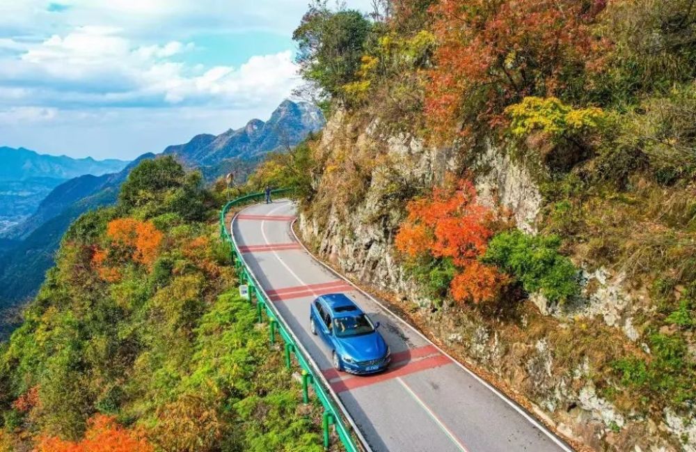 层峦叠嶂的山岗、变化万千的风景、湛蓝如洗的天空……道路一面是绿意葱茏的青山,一面是万丈悬崖,在此自驾,犹如行驶在天路之上。