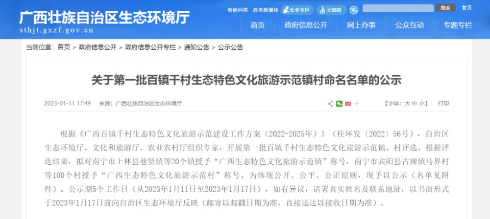 1月11日,自治区生态环境厅公示第一批百镇千村生态特色文化旅游示范镇村评选结果,全区共20个镇和100个村榜上有名,其中,河池市1个镇、7个村上榜。