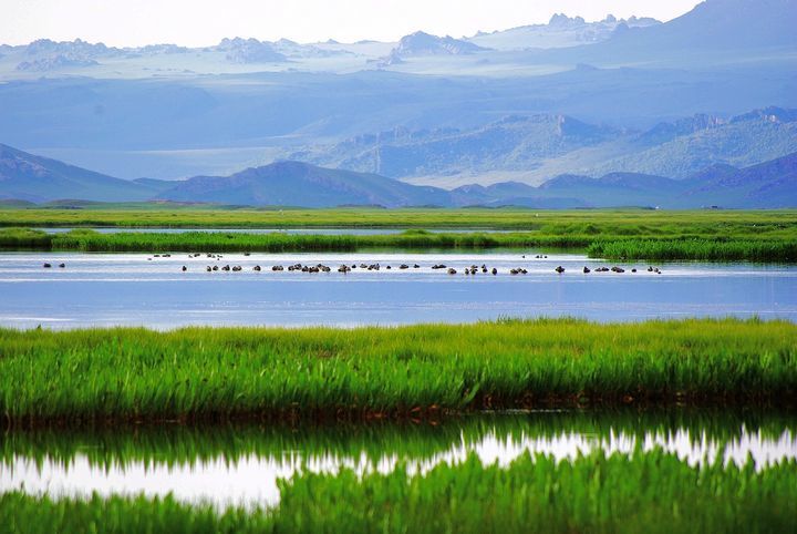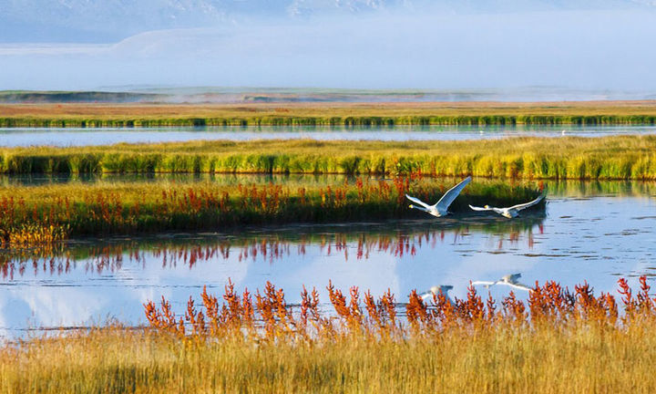 4、依协克帕提湖,在阿尔金山脉雄伟的祁曼塔格山脚下,库木库里沙漠南部,“隐居”着美丽的高原淡水湖——依协克帕提湖。湖面海拔3850米,面积虽只有18平方公里,但湖周因植被丰富,景色独特,在咸水湖泊密布的羌塘高原,是一奇观。湖中散布着几座小岛,湖水深1—3米,弯曲迂回的湖岸连着片片沼泽,每年春夏之交,成千上万只黑颈鹤、白鹭、银鸥、灰鹤、斑头雁、棕头欧、赤麻鸭、绿头鸭、红脚鹬等候鸟从东南亚和我国云贵高原飞来依协克帕提湖生息繁育。