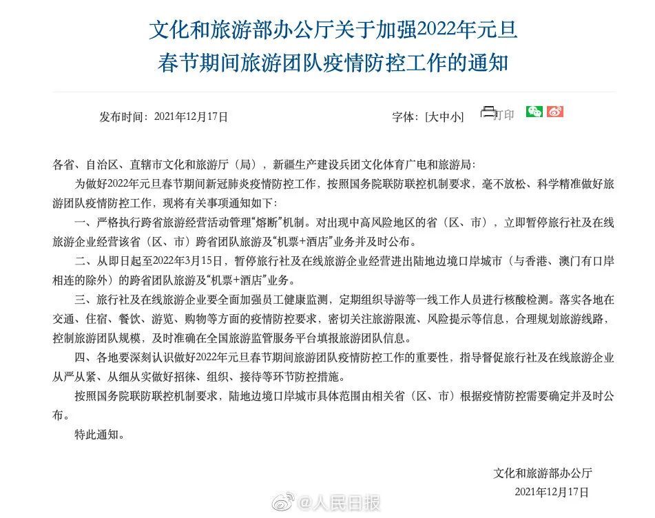 12月17日,文化和旅游部发布通知,要求严格执行跨省旅游经营活动管理“熔断”机制。对出现中高风险地区的省(区、市),立即暂停旅行社及在线旅游企业经营该省(区、市)跨省团队旅游及“机票+酒店”业务并及时公布。