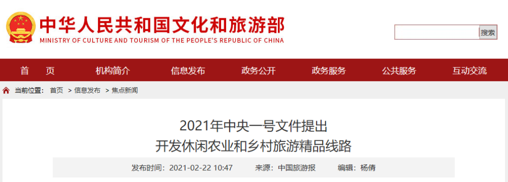 2021年中央一号文件提出开发休闲农业和乡村旅游精品线路