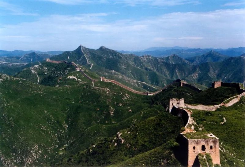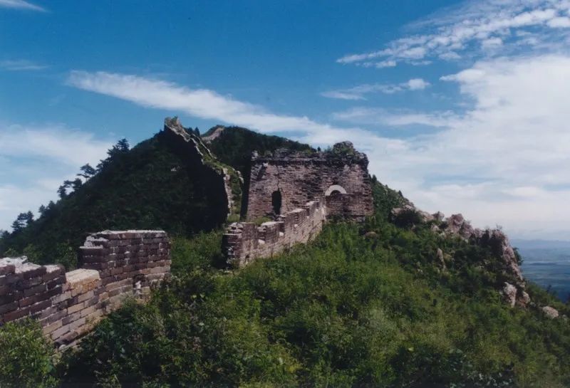 这里的长城墙基颜色是白色、黑色,白色是风化造成的,已经历几百年沧桑。垛口、敌楼只剩下残垣断壁。向山下望去,清晰的看到一条盘山道顺着燕山山脉蜿蜒起伏,一路向东。