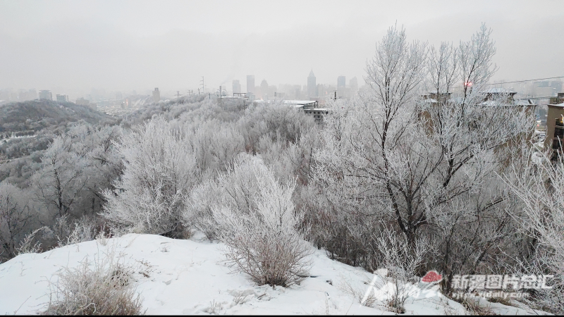 1月11日早晨,乌鲁木齐天空飘着雪花,雅山公园的树梢上挂满了雾凇和雪花。石榴云/新疆日报记者张万德 摄