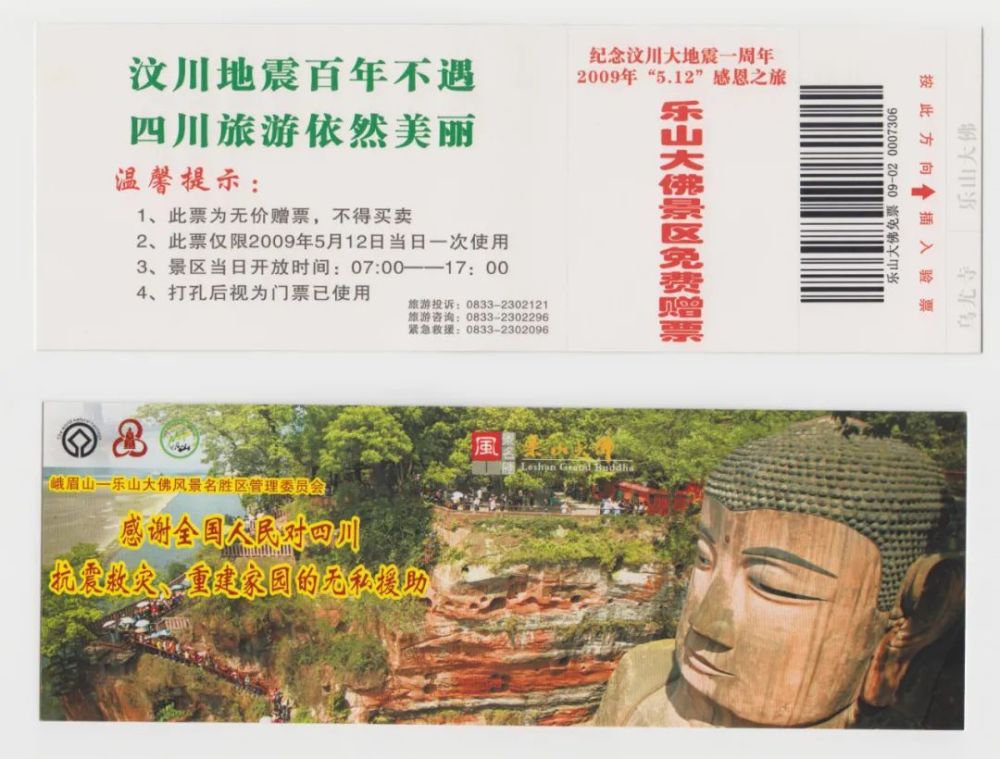 到上世纪七十年代中期,乐山大佛景区门券上,开始出现乌尤山和凌云山的剪影,颜色也变成红、黄、绿等色。