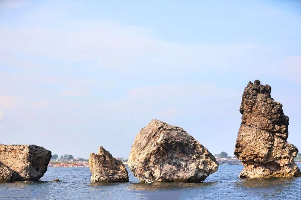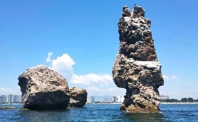 葫芦岛绥中碣石由三块高出海面20米左右的巨大礁石组成。东边一块礁石从远处望去,如一人矗立在海中,因此也称“姜女石”。