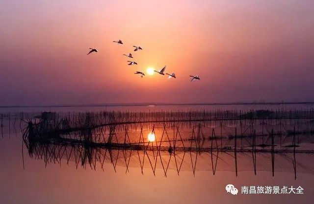 鄱阳湖,位于南昌、九江交界处的长江南岸。鄱阳湖分丰水、枯水两季。夏秋丰水季节时鄱阳湖好像大海一望无际,湖上有浪潮翻腾,周围绿色遍地,十分壮观。枯水期则有大片的水滩出现,有茂盛的芦苇荡和野草丛,牛羊在其间出没,景色也十分美丽。若要观赏鄱阳湖湖景,丰水期会比较壮观,鄱阳湖在南昌境内水域仅占百分之十,靠近南昌这一带的湖区并不是开阔的大湖景色,而是遍布着一片片的湿地水塘,可以看到沼泽小湖和芦苇水鸟等湿地风光。