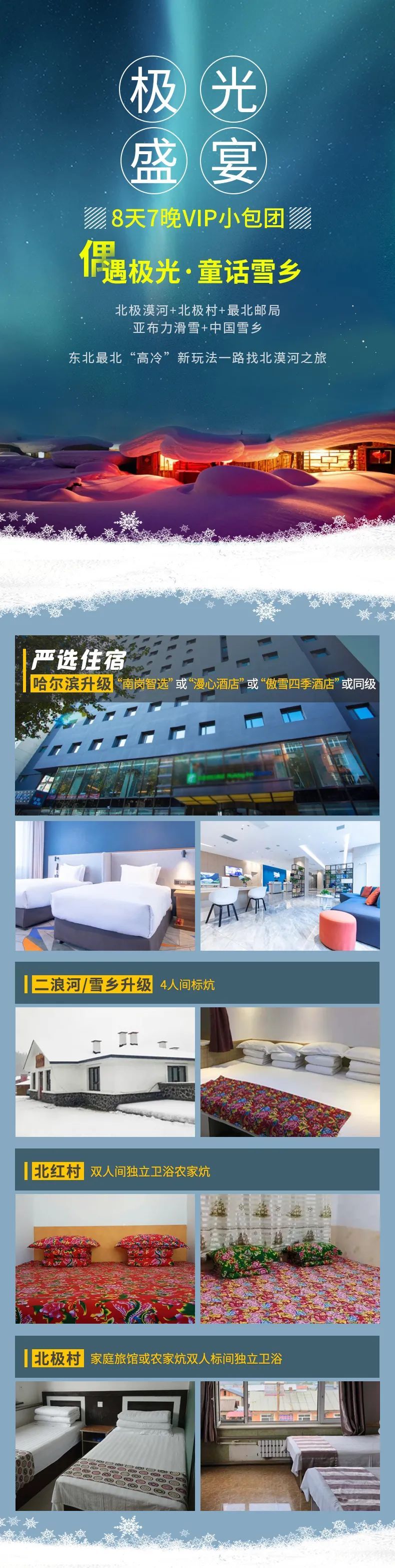 1、住宿:哈尔滨四钻酒店双标间1晚,二浪河、雪乡4人间独立卫浴农家炕;北红村家庭农家炕双人标间独立卫浴、北极村家庭旅馆或农家炕双人标间独立卫浴;