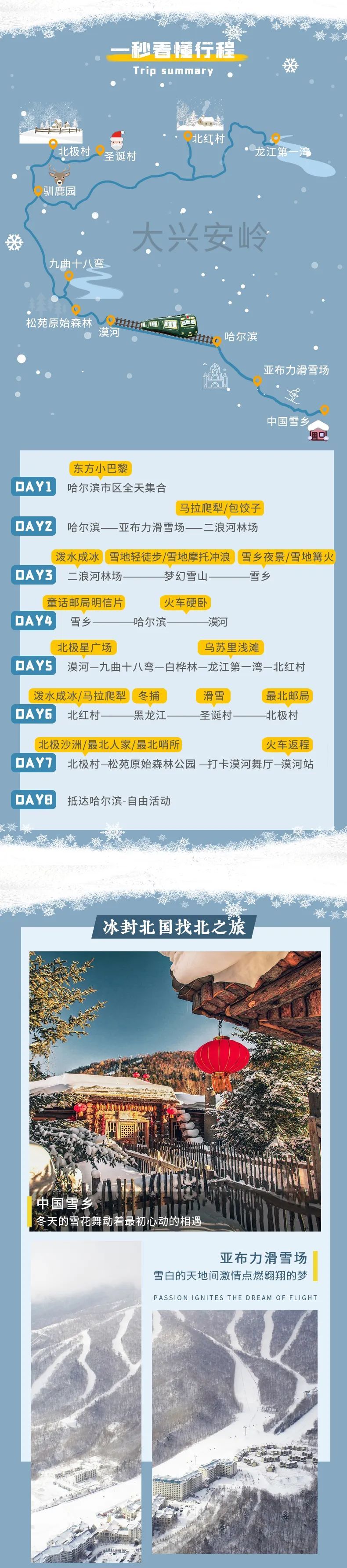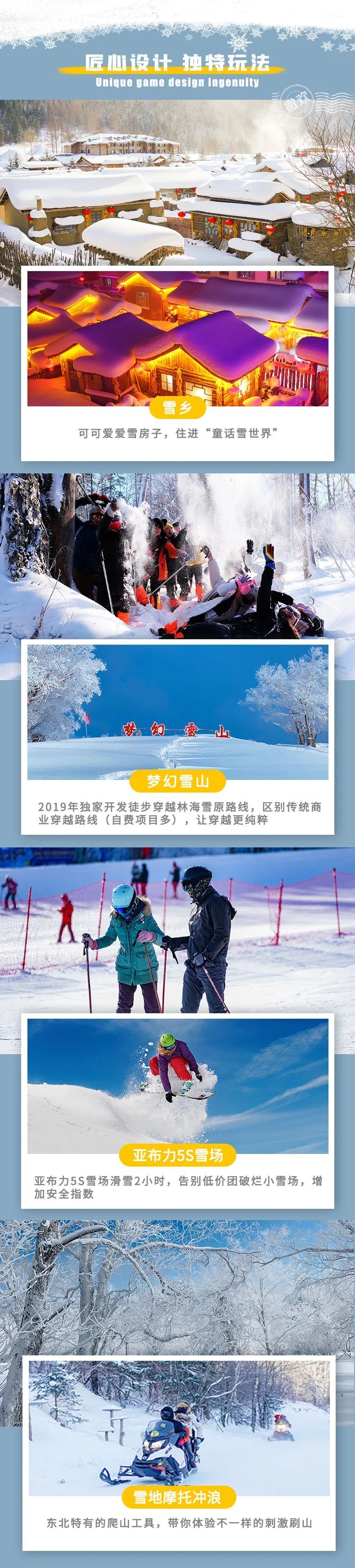 4、门票:亚布力2小时滑雪包含雪鞋雪板雪杖使用、雪乡门票+往返环保车、梦幻雪山徒步穿越门票;九曲十八弯门票、龙江第一湾门票、圣诞村门票、北极村门票、鄂温克驯鹿园;