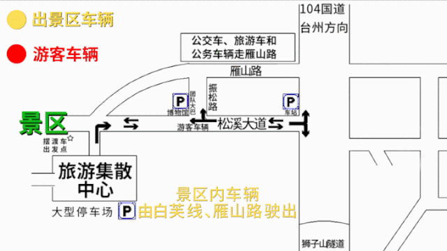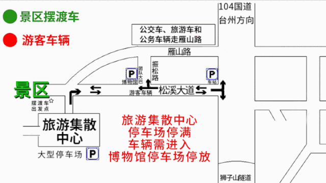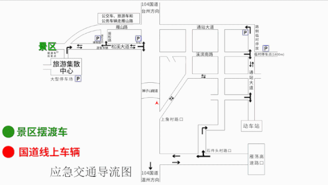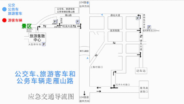 遇旅游集散中心停车场、雁荡山博物馆、雁荡山车站无法容纳车辆停放时,实行交通分流。在104国道上的车辆(除大型车辆外)从溪滨南路进入通站大道临时有序停放,由公交车进行接送。