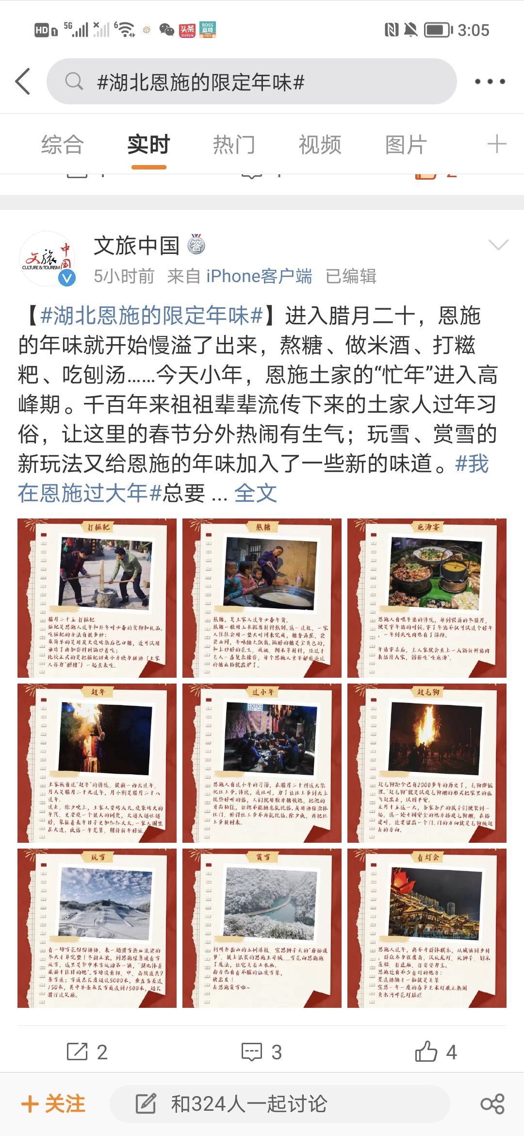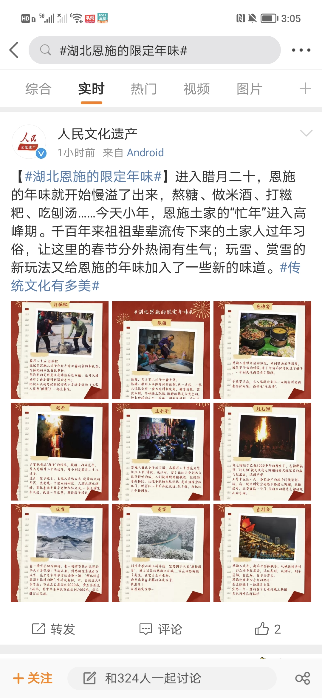 火了,又上热搜了!熬糖、做米酒、打糍粑、吃刨汤……1月14日,由@恩施州文化和旅游局 主持的话题#湖北恩施的限定年味#,继#我在恩施过大年#后再次登上微博热搜,吸引众多网友关注,让恩施在微博上又一次“火出圈”。