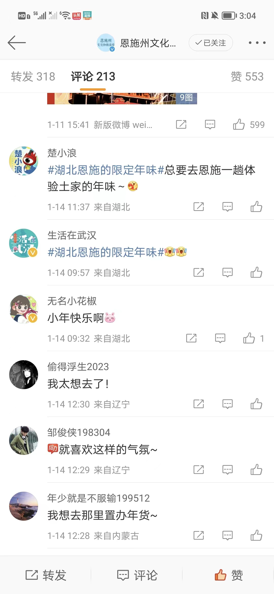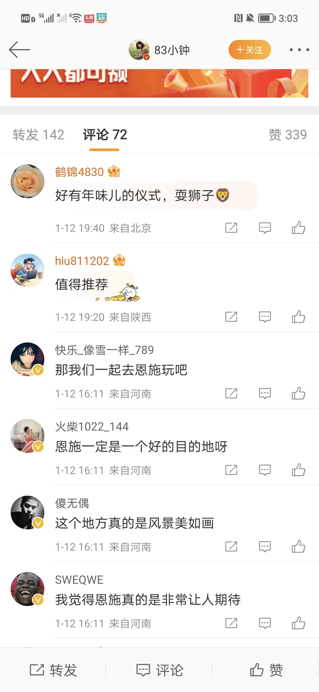 据悉,该活动将持续至2023年11月30日,带话题#玩转恩施快乐出发#发布恩施“吃住行游购娱”等方面原创种草内容,就有机会获得最高3000元“种草奖金”。该活动发布后,@湖北省文旅厅、@文旅中国、@人民文化遗产 等官方账号争相转发,助推恩施文旅成聚焦引发网友热议。@鱼游天下、@83小钟、@江涛视觉、@小鱼儿whu乖乖等多位百万级粉丝博主纷纷自发发布恩施种草博文,回忆在恩施的美好时刻,并向全国网友推介恩施地道年味。@83小钟还在微博推介到“春节来湖北,想感受不一样的民族魅力,体验不一样的民俗风情,想解锁绝美的山水名胜,那恩施一定是个上好的目的地!”