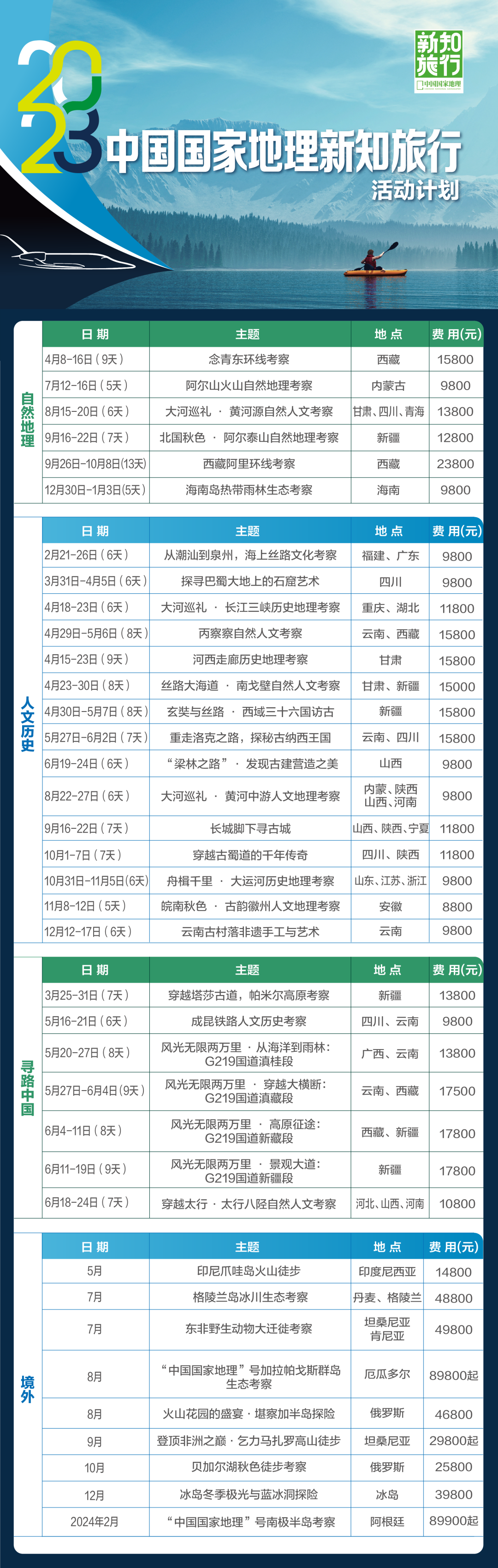 (上述各项活动详情,以活动报名最终发布为准,敬请关注“中国国家地理科学考察”公众号后续相关发布。境外活动须在文旅部宣布出境游开放后才能预订。)