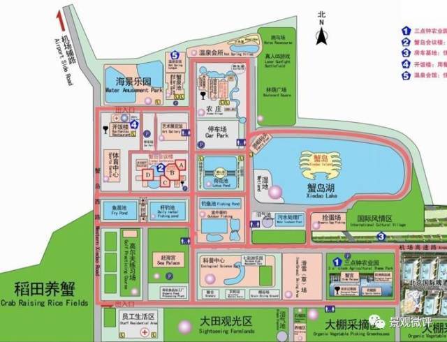北京蟹岛绿色生态度假村位于北京市朝阳区金盏乡境内,紧临首都机场高速路,距首都国际机场仅7公里,是一个集生态农业与旅游度假为一体的大型项目。总占地面积3300亩,以餐饮、娱乐、健身为载体,让客人享受清新自然、远离污染的高品质生活为经营宗旨,以生态农业为轴心,将种植业、养殖业、水产业、有机农业技术开发、农产品加工、销售、餐饮住宿、旅游会议等餐饮住宿、旅游会议等产业构建成为相互依存、相互转化、互为资源的完善的循环经济产业系统,成为一个环保、高效、和谐的经济生态园区。包括大田种植区、蔬菜种植区、苗木花卉种植区、养殖区、休闲旅游服务区等功能区。