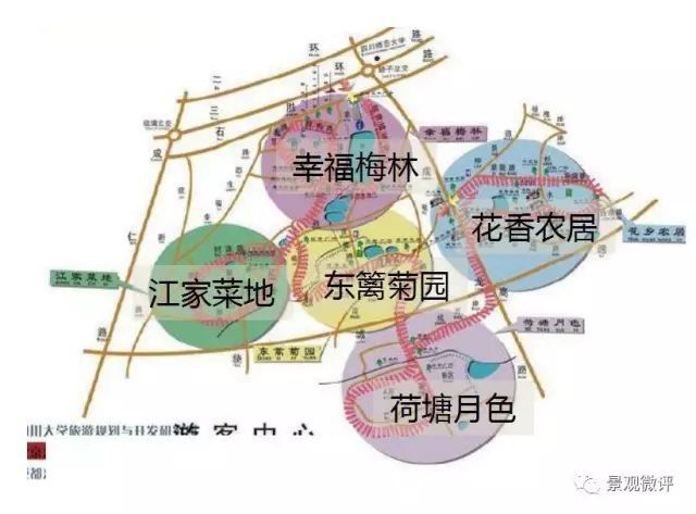 “五朵金花” 是指三圣乡东郊由红砂、幸福、万福、驸马、江-家堰、大安桥等6个行政村组成的5个乡村旅游风景区,通过以“花香农居”、“幸福梅林”、“江家菜地”、“东篱菊园”、“荷塘月色”为主题的休闲观光农业区的打造,现已成为国内外享有盛名的休闲旅游娱乐度假区和国家5A级风景旅游区。其成功之处就是在乡村休闲的一个主题下,按照每个乡村的不同产业基础,打造不同特色的休闲业态和功能配套,将乡村旅游与农业休闲观光、古镇旅游、节庆活动有机的结合起来,形成了以农家乐、乡村酒店、国家农业旅游示范区、旅游古镇等为主体的农村旅游发展业态。