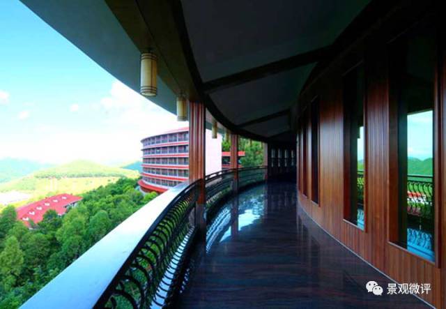 根据客家围龙屋的反围龙结构建造,建筑面积12000多平方米,楼高6层,从大堂进入直接到第4层,上下各3层,共有标准房、套房和单间138间。每个房间都有一个特别设置阳台,站在阳台上可以尽情观赏度假村的美景,这是酒店最突出的特色之一。