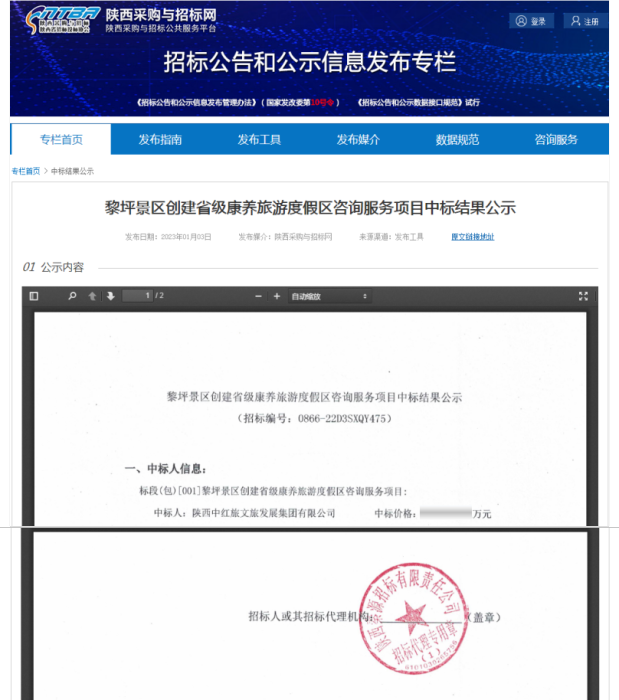 2023年1月3日,中红旅成功中标陕煤集团旗下黎坪景区创建省级康养旅游度假区服务项目!